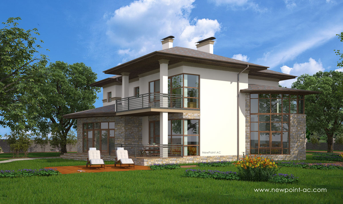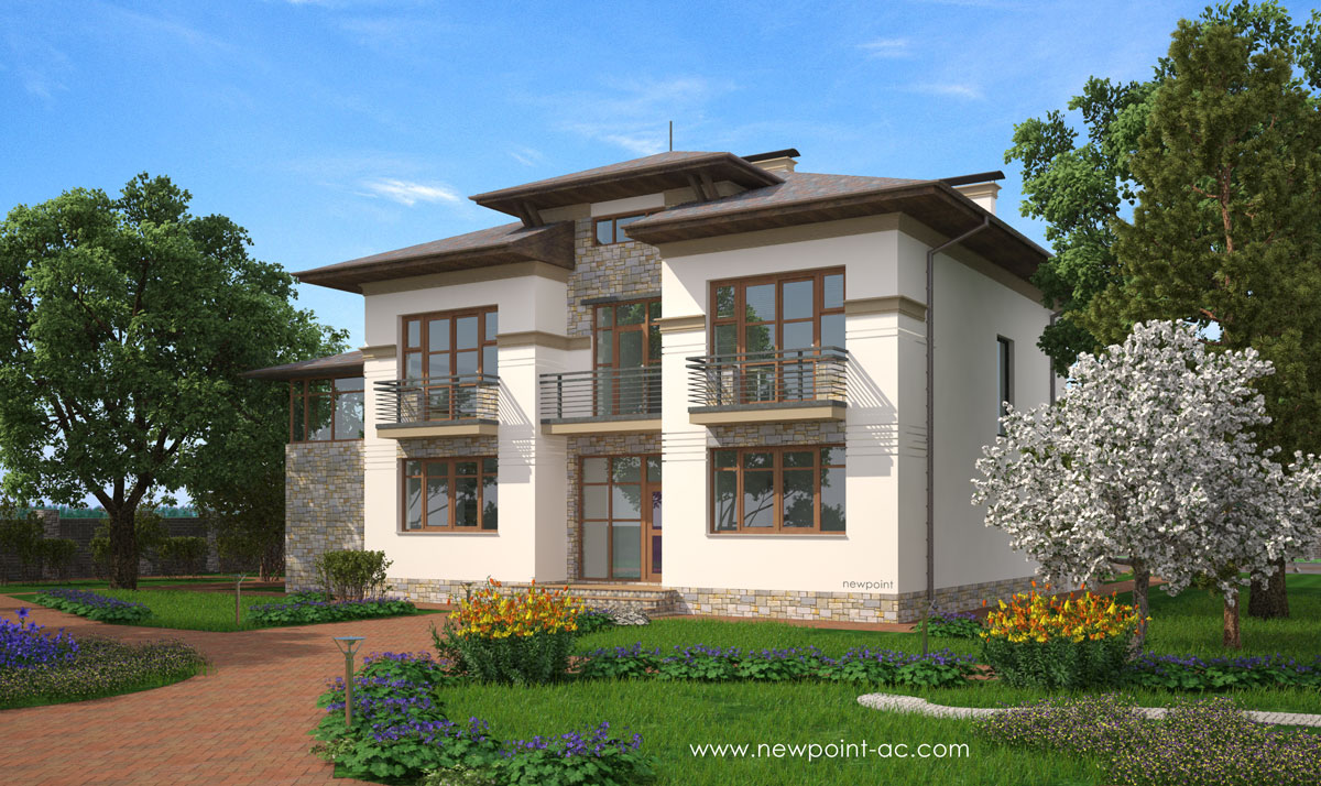 отделка фасада: декоративная штукатурка, натуральный камень