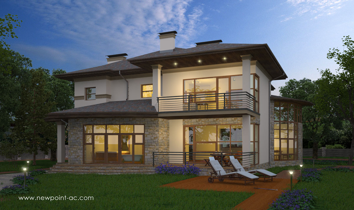 Большая остекления площадь почти с каждой стороны дома дарит ему дополнительное естественное освещение и возможность созидание красочных пейзажей за окнами. Это преимущество получает почти каждое помещение первого этажа. Очень оригинально продумано условное разделение одного большое пространства, которое включает в себя светлую гостиную, с большой, крытой террасой, она идеальна для барбекю летом, а зимой яркие лучи пламени камина, пробиваясь через витраж, создадут приятную атмосферу в доме. Кухня большая и очень удачно спроектирована, там есть и кладовая, и функционально отделена столовая в виде эркера с большим витражом, что позволит всей семьи и гостям, наслаждаться вкусными блюдами. Такое пространство это мечта любой хозяйки.