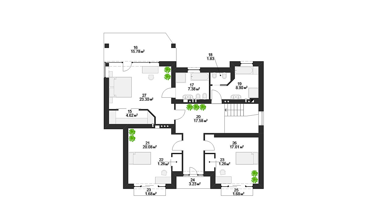 По ступенькам мы подымаемся на второй этаж, где большой холл с выходом на балкон соединяет три просторные и светлые спальни. Стоит отметить, что каждая из них имеет свой собственный балкон. В зависимости от предпочтений и потребностей будущих хозяев, одна из них, самая большая имеет собственный гардероб, санузел и огромный балкон, где за чашечкой кофе Вы встретите рассвет или проведете закат. Две остальных спальни равноценны и могут служить детскими комнатами с собственными гардеробами и большой ванной комнатой в холе.