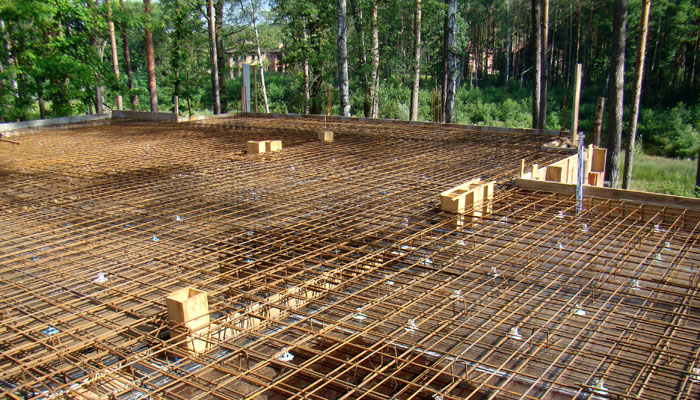 - Виставляється опалубка стрічкового (за проектом) фундаменту. Після цього починається в'язка арматурного каркасу. Важливо щоб діаметр стрижнів, крок їх розташування і зазначений захисний шар бетону повністю відповідав проектним.
