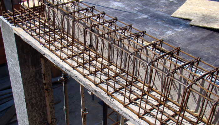 - Влаштування перекриття першого поверху. В даному випадку перекриття - монолітне залізобетонне. На фото показаний етап в'язки арматурного каркаса.