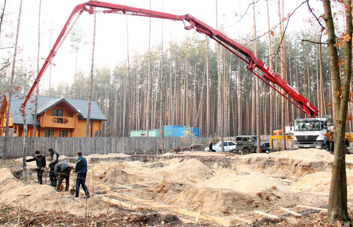- В даному випадку бетонування фундаменту виконується за допомогою авто-бетононасосу, так як заїзд на ділянку важкої техніки неможливий. Важливим моментом на цьому етапі є повна відповідність марки бетону з проектною і якісне вібрування бетонної суміші в опалубці.
