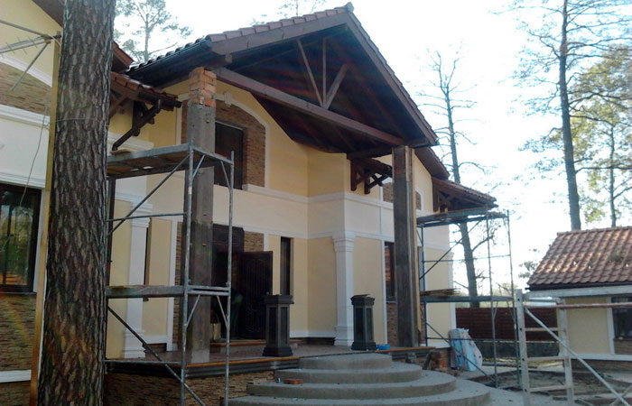 - Приклад оздоблення фасаду декоративною штукатуркою в поєднанні з плиткою під натуральний камінь і декоративними елементами. Влаштування ганку з криволінійними сходами.