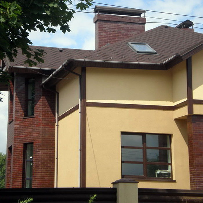 - Приклад поєднання штукатурки з дерев'яними декоративними елементами і клінкерною плиткою. Покрівля виконана з м'якої черепиці.