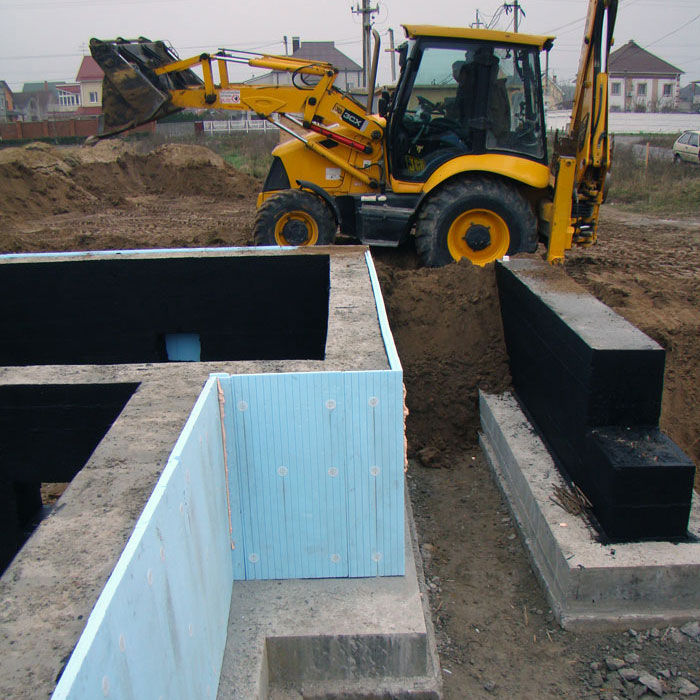- По аналогії виконується заливка стінок фундаменту або монтуються фундаментні блоки (ФБС). Після, виконується гідроізоляція та утеплення фундаментів. Це не менш важливий етап, оскільки від цього залежить довговічність конструкції.