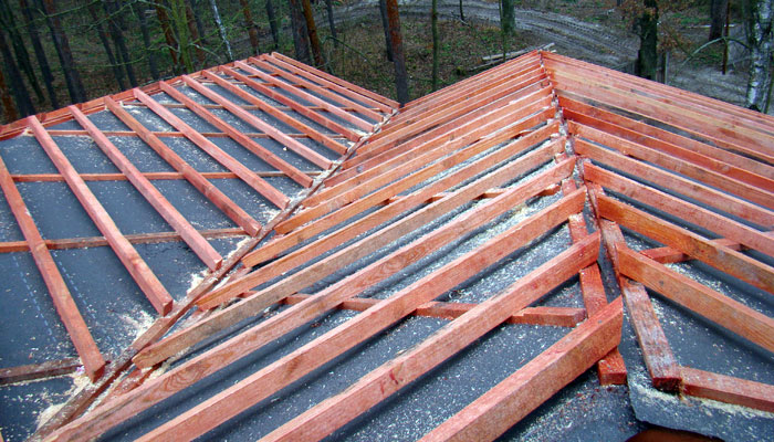 - Монтаж дерев'яної покрівельної системи. На фото показано виконання риштування під цементно-піщану черепицю. Вогне-біо захист деревини виконана для кожного окремого елемента.
