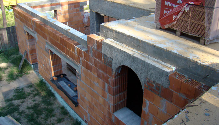 - Зведення внутрішніх та зовнішніх стін. В даному випадку зовнішні стіни виконані з пустотілого керамічного блоку Porotherm 44 P + W, внутрішні - з глиняної цегли марки М100 на розчині марки М50.