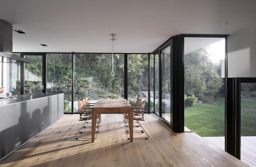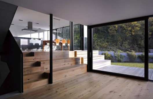 Великі вітражі розташовані на південь, так як енергозберігаючі вікна дозволяють витримувати клімат навіть у Німеччині. Планування дуже зручне, житлові кімнати батьків і дітей розташовані на 1-му поверсі, а рівнем нижче є гостьові кімнати, тобто будинок спроектований в двох рівнях. Це прекрасний приклад сучасної архітектури и технологій!